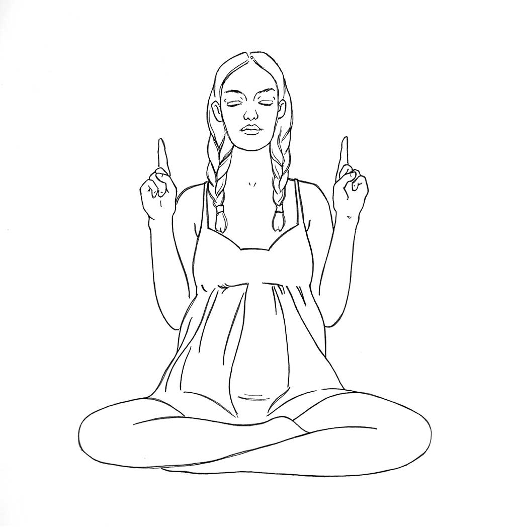 Mudra: Make fists with both of your hands and extend your pointer finger, or Jupiter finger, out on both hands. The fingers should be pointing straight up and elbows are relaxed against the body. You can practice this from eleven to thirty-one minutes.